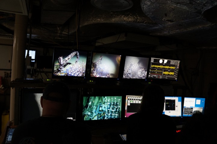 無人深海探査艇ネーレウスがケルマデック海溝から送る映像を見守る研究者。ケルマデック海溝は、世界でも最深の海溝に数えられる。(写真提供:サディー・ミルス)