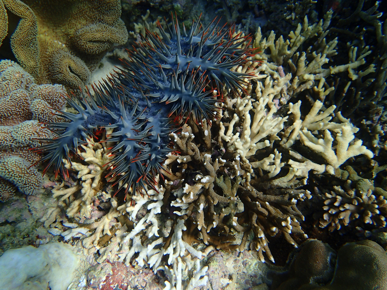 数種類のMontiporaサンゴを捕食しているオニヒトデ(Acanthaster planci)。この写真は、OISTマリンゲノミックスユニットの座安祐奈博士が、沖縄県本部町の瀬底島の沖合で撮影した。