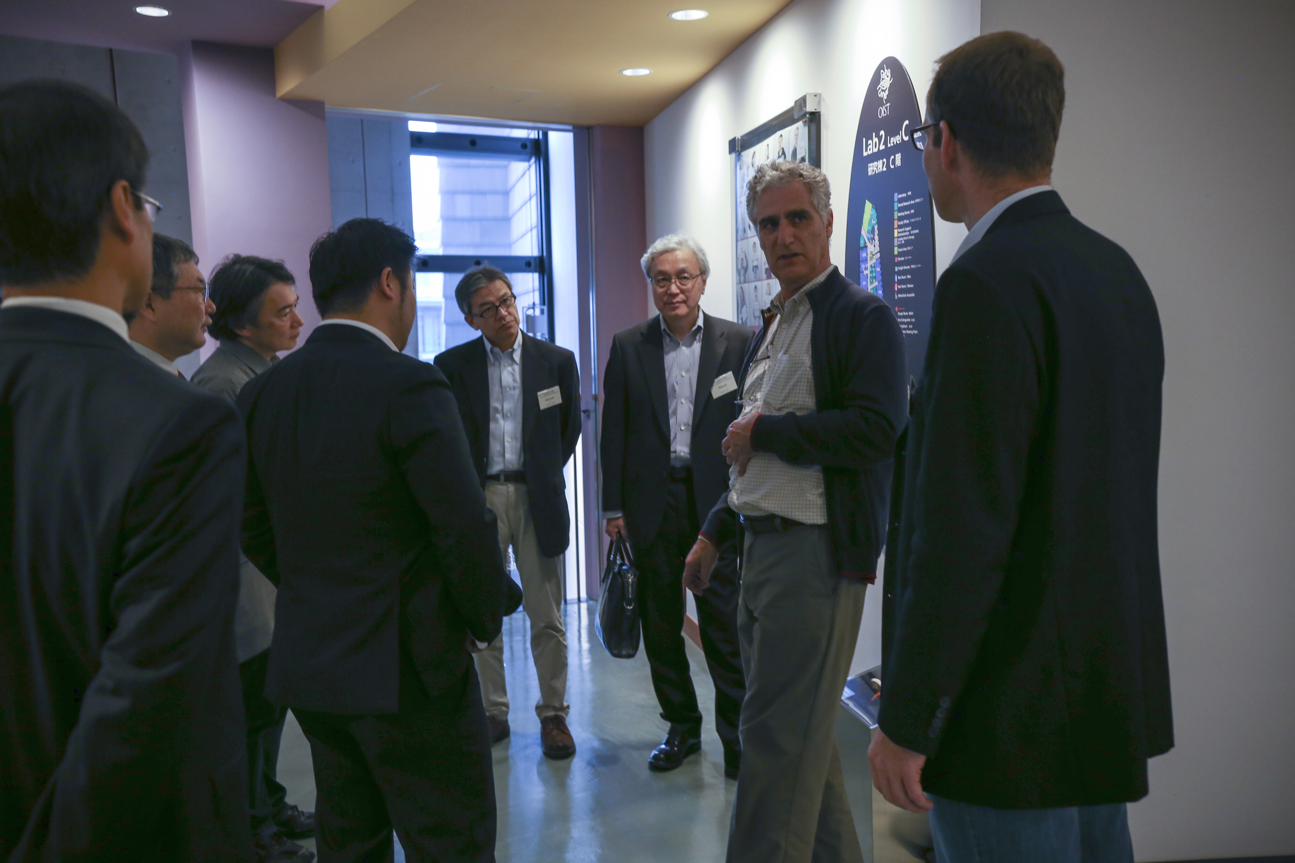 OISTのジョン・ディキソン副学長(施設管理担当)の案内により、OIST研究棟のユニークなレイアウトを解説する見学ツアーが行われた。