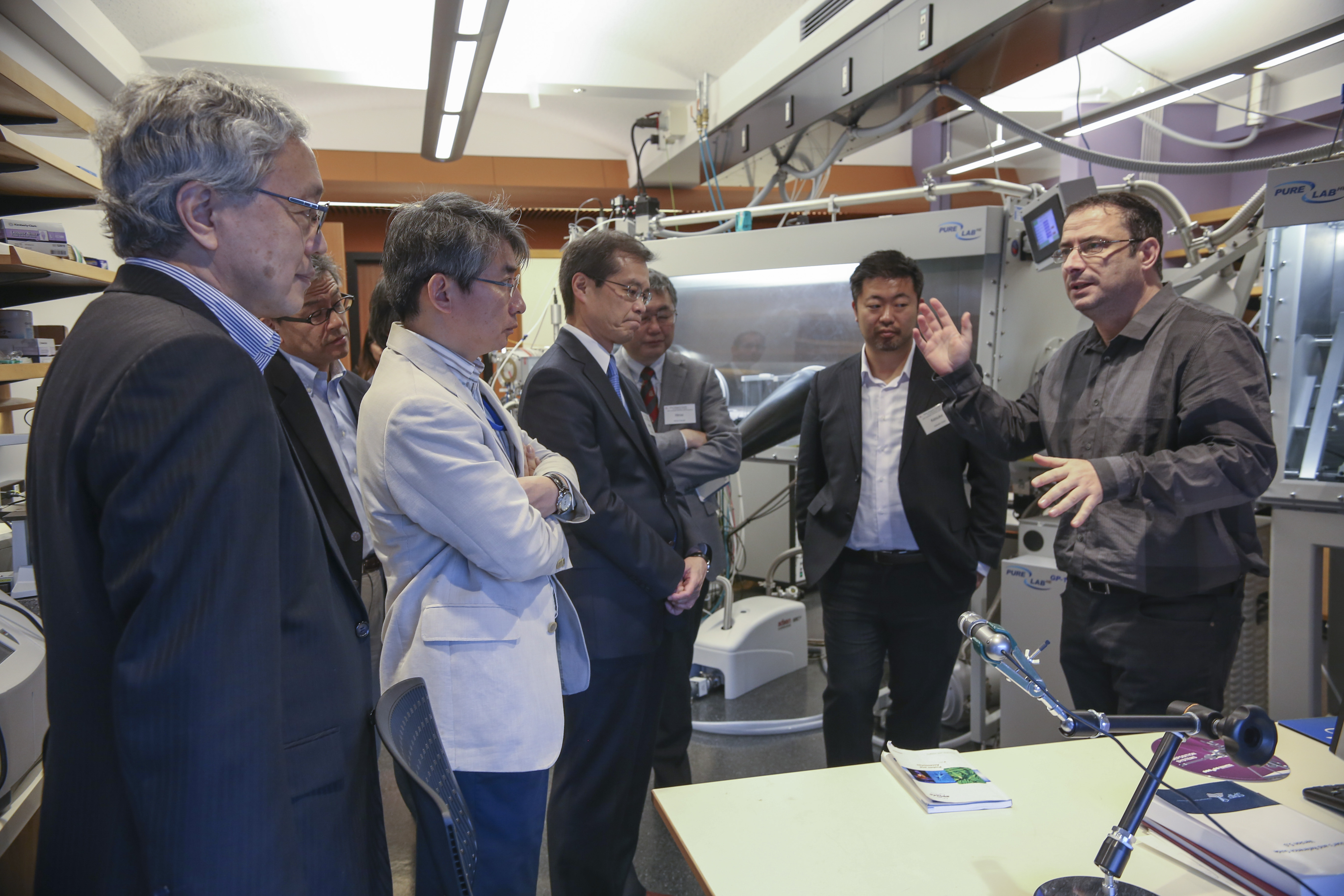 東京大学の教授の方々はOISTの研究エリアを数多く回ることで、様々な教員と会い、OISTで行われている研究についてより詳しく知る機会がもたらされた。上の写真は、カスタムメイドのナノ粒子を作製するムックレス・ソーワン准教授の研究室を見学しているところ。