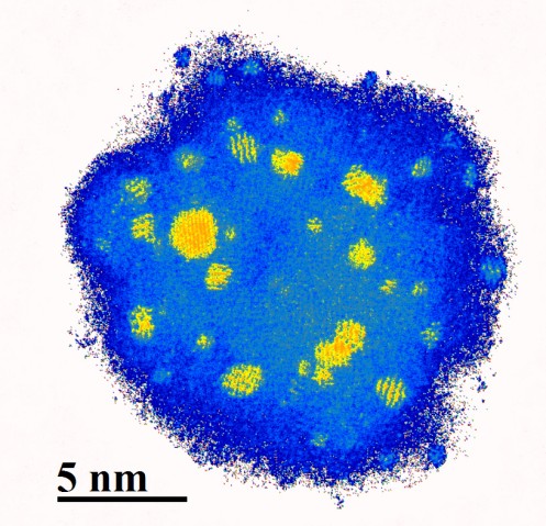 このイメージの黄色の領域は銀のナノクラスターを示し、単結晶構造を有しており、アモルファスシリコンナノ粒子(青の領域)内において結晶化を誘導するために用いられます。
