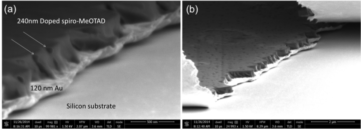 ドープしたspiro-MeOTAD層と問題のピンホール(写真右)で形成されたチャンネル(写真左)の横断面を示す高倍率走査電子顕微鏡写真。このチャンネルが水および他の分子を容易に通過させて太陽電池内に拡散させてしまう。