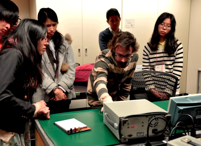 OISTエネルギー材料と表面科学ユニットのアンドリュー・ジャスティン・ウィンチェスターさんからアナログ回路のつくり方を学ぶサイエンスチャレンジの参加者たち