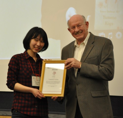 ジョナサン・ドーファン学長からOISTサイエンスチャレンジ2015で優勝証書を受け取る古賀夢乃さん。古賀さんは、早稲田大学で生命科学を専攻している。