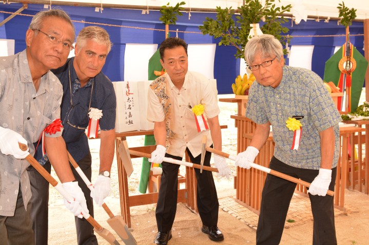 事始め(ことはじめ)の儀で盛砂に鍬入れを行うことで工事の始まりを神様に告げる。写真左から2番目はOISTジョン・ディキソン副学長(施設管理担当)。