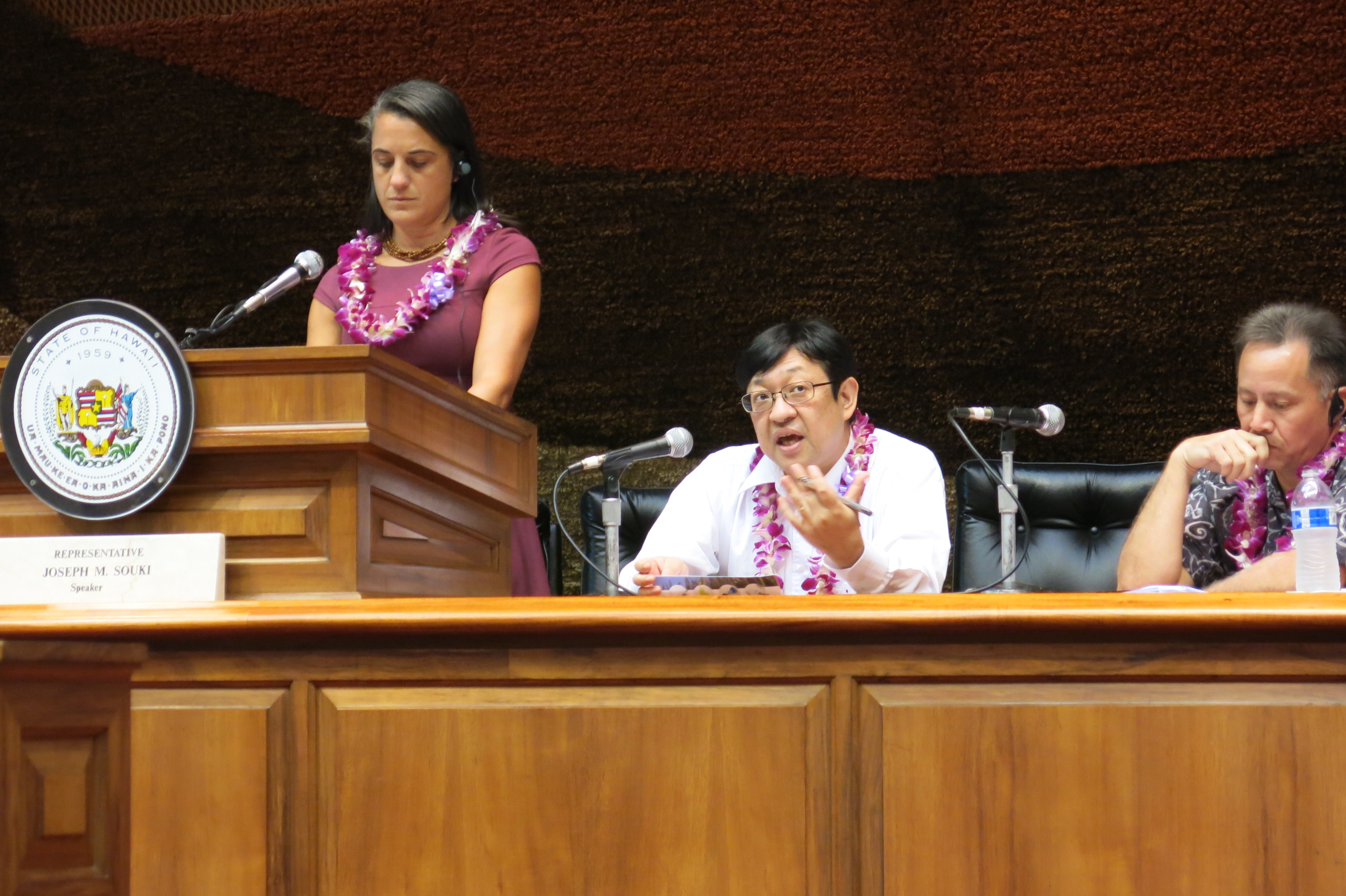 7月10日(日本時間11日)、ハワイ州議会議事堂で行われたハワイ・沖縄エネルギー・イノベーション・フォーラムに登壇したOIST北野宏明教授(中央)