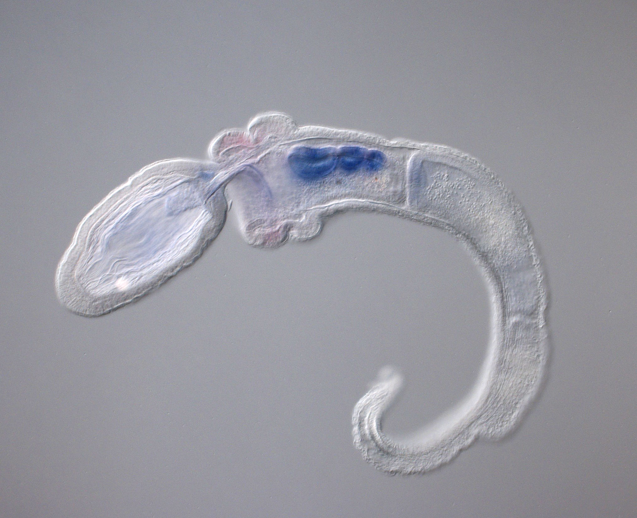 クビナガギボシムシ幼体。成体の鰓になる領域が青色の染色によって示されている。 (写真提供: Andrew Gillis)