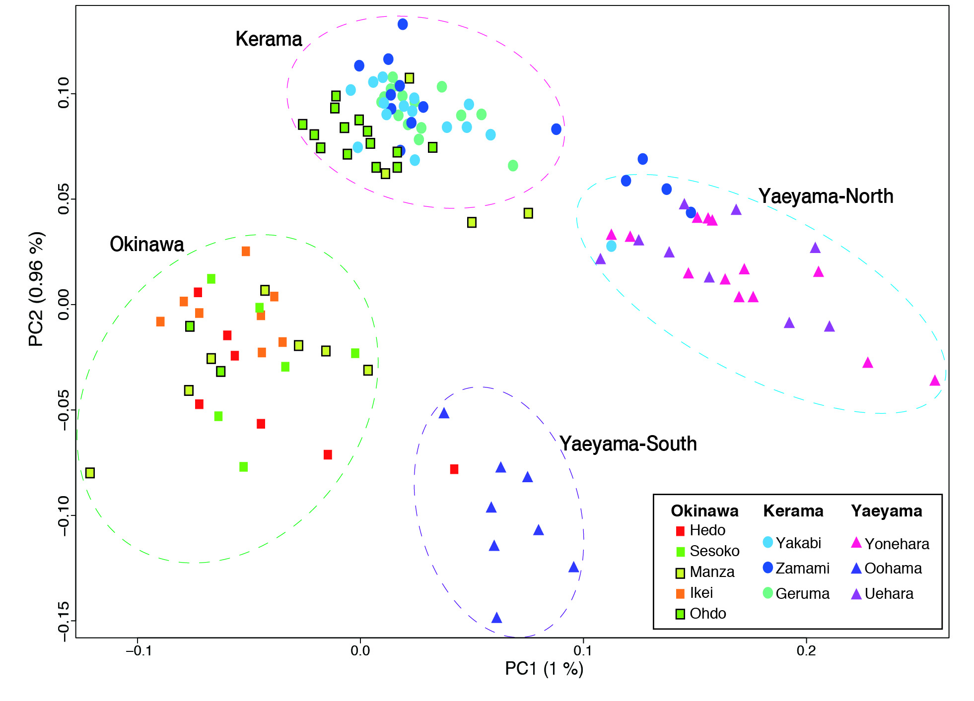 沖縄県のコユビミドリイシ4つのDNAグループ(沖縄本島、慶良間諸島、八重山南、八重山北)。一つの点が一個体を示している。島々の間で幼生が頻繁に行き来していないので、近い地域ではゲノムDNAが似ており、地域ごとにグループを形成している様子が分かる。