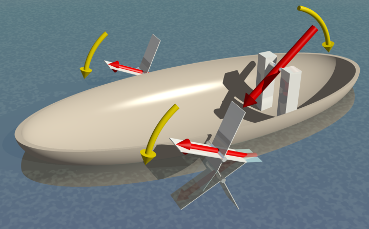相互に作用する3つの磁石(赤色の矢印)で駆動するパドル船のモデル。2つの磁石がパドルに、もう1つが駆動装置に接続されています。駆動装置の磁石の回転に従ってパドルが動きます(黄色の矢印)。