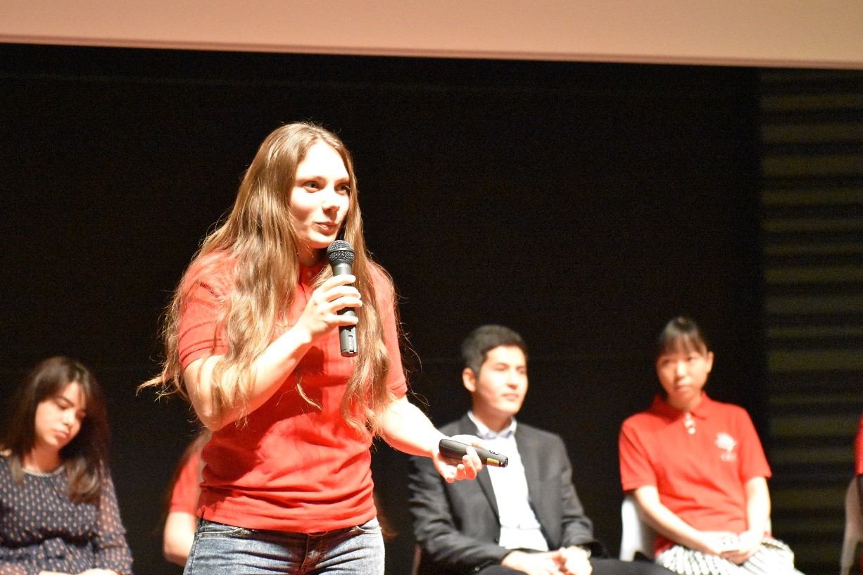 世界の未来について発表を行うOIST学生のイリーナ・レショドコさん