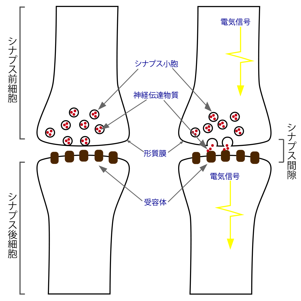 右図:電気信号がひとつの神経細胞の末端に達すると、それが引き金となり、送り手側の神経細胞(シナプス前細胞)にあるシナプス小胞と神経末端の形質膜が融合し、受け手側の神経細胞(シナプス後細胞)とのすきまであるシナプスの間隙(かんげき)に、小胞体内の神経伝達物質が「放出」される。放出された神経伝達物質は、シナプス後細胞にある受容体を活性化し、それにより、シナプス後細胞内で電気信号が誘発されることによって情報の受け渡しが行われる。空になったシナプス小胞は、シナプス前細胞末端膜に再び取り込まれ、再び、伝達物質を充填して再利用される。シナプス前末端細胞内では、多種類のタンパク質が伝達物質の放出と小胞の再利用に関わる複雑なプロセスをコントロールしている。シナプス小胞体の回収と再利用はシナプスの機能の維持にとって大変重要で、これがなければシナプス小胞の伝達物質は枯渇して、機能しなくなる。