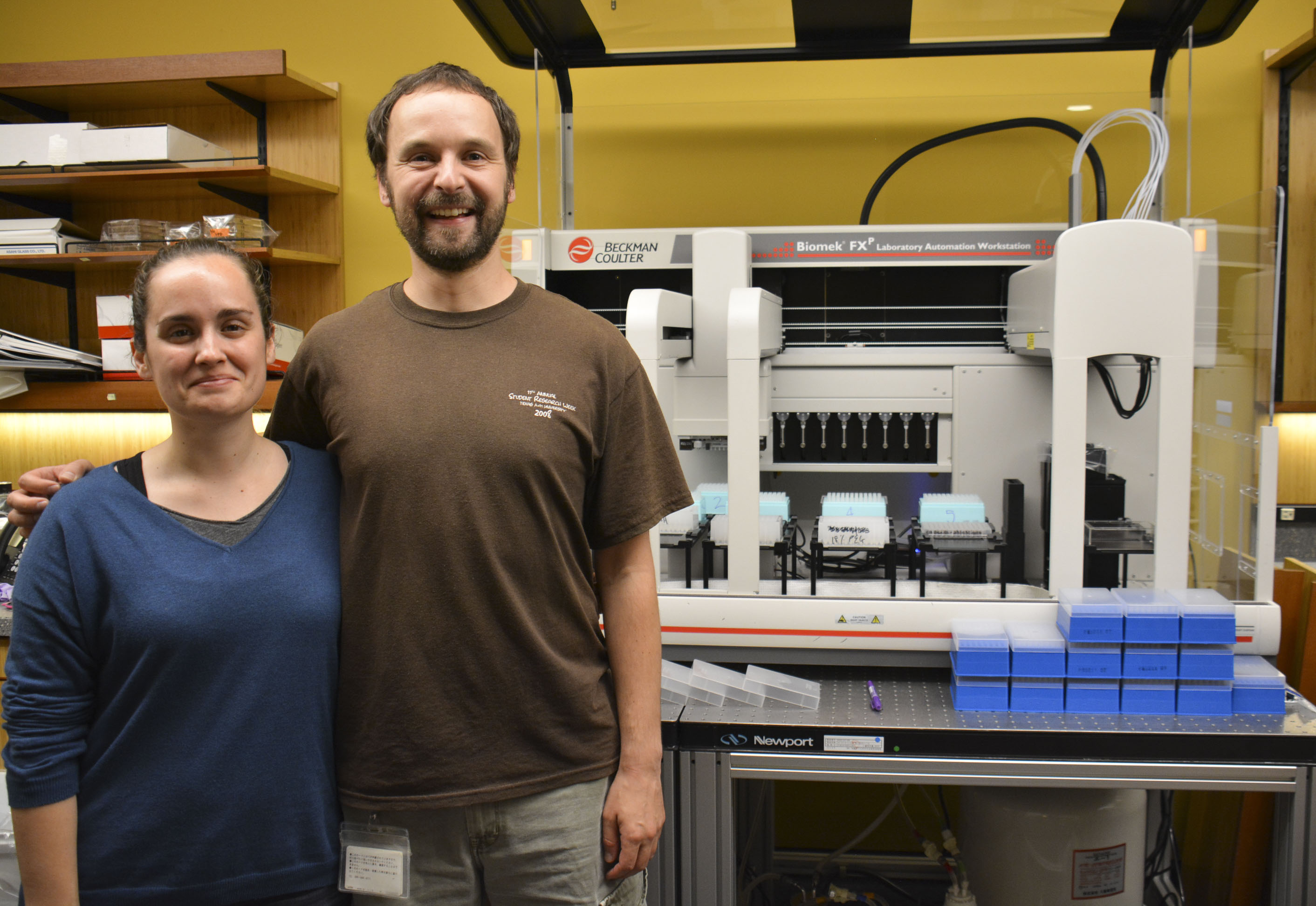 ムハンダン 博士とミケェエブ准教授。遺伝子解析のサンプル準備に使用したロボットの前で。