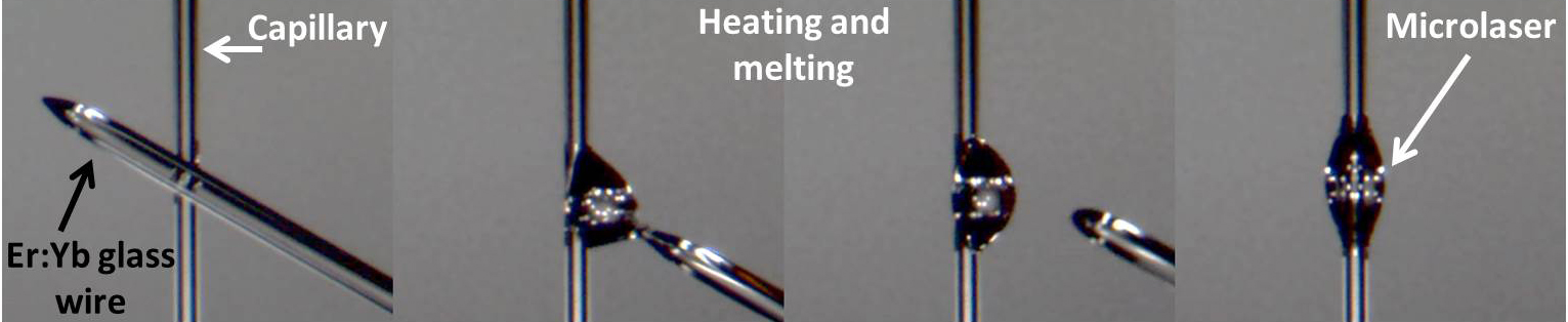 ガラスウェッティング新方式でマイクロレーザーを作製。イッテルビウムもしくはエルビウムを添加したリン酸塩ガラス(融解温度:摂氏500度)を溶かし、ケイ素(溶解温度:摂氏1500度)の中空毛細管の周囲に流し込む。