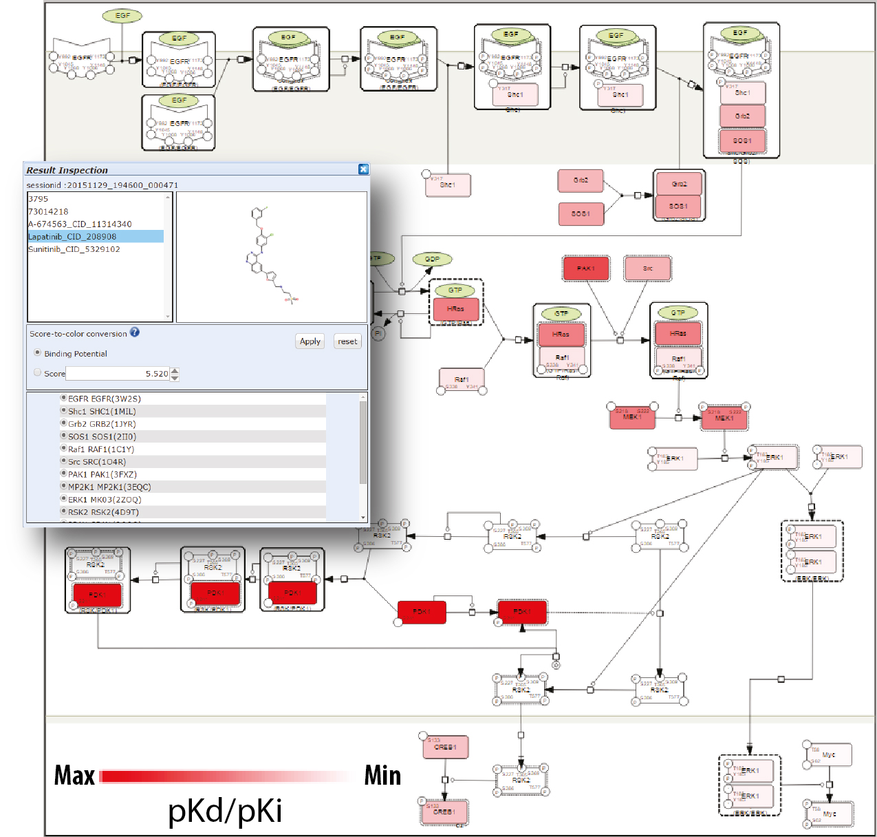 新薬候補の化合物の生体分子に対するスクリーニング結果を地図のような形で可視化したもの。予想される結合親和性に合わせ、分子の色が白から赤への勾配色として表示されている。