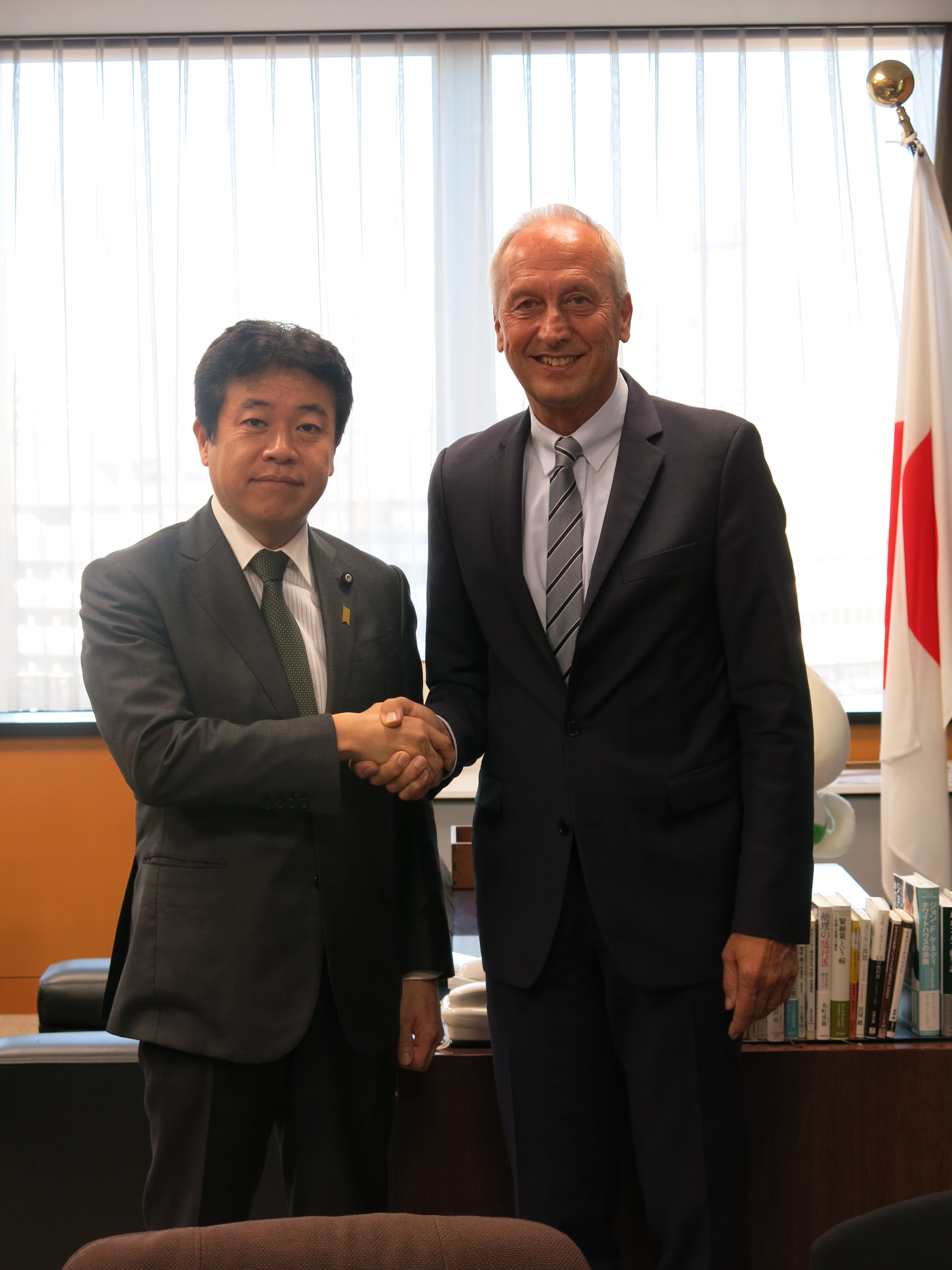 鶴保庸介 沖縄及び北方対策担当大臣(左)とピーター・グルース博士(右)