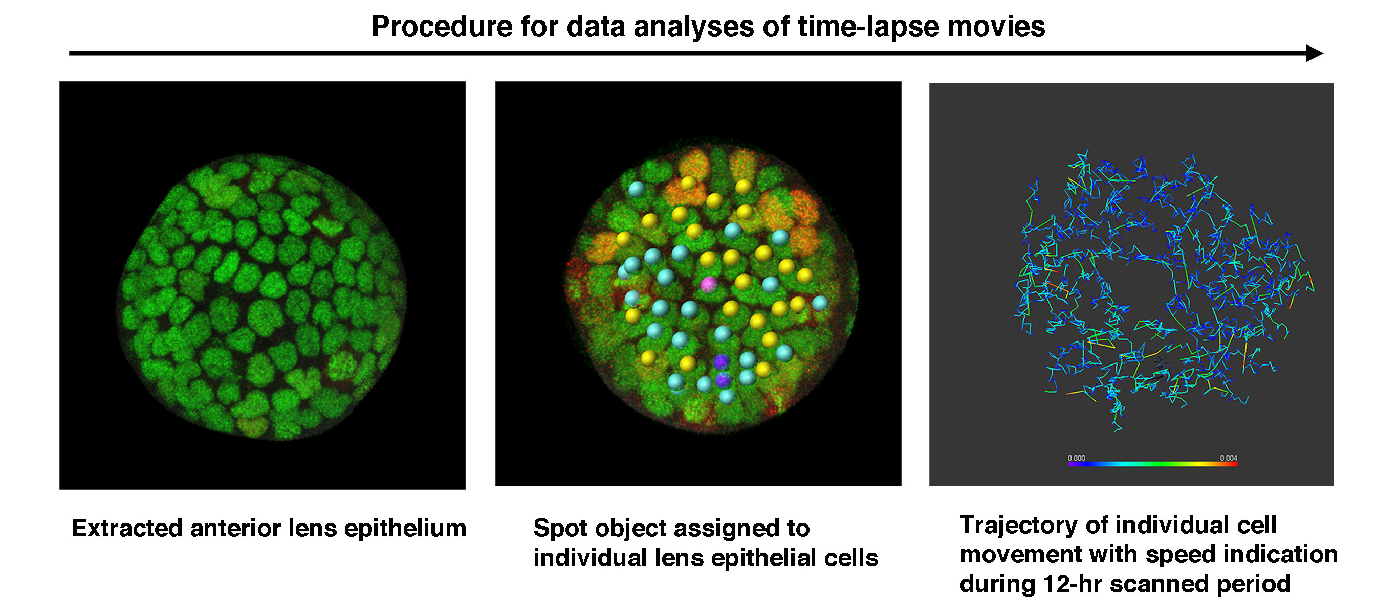 各細胞の発達過程を追跡する方法。左図は共焦点顕微鏡を使って上皮細胞を観察した画像。中央は、各細胞を分裂経験細胞(黄色)、非分裂細胞(水色)、細胞死に至る細胞(紫色)に色分けした画像。右図は各細胞の移動軌跡を線で示した画像で、移動軌跡の線上にその時点での移動速度を色で示したもの。