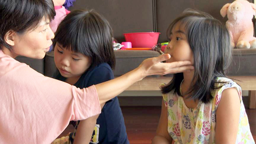 NFPPジャパン(ニューフォレスト・ペアレンティング・プログラム・ジャパン)は、ADHDを持つ児童の母親により効果的な子育てを習得してもらうための支援を提供します。この写真は、NFPPジャパンに取り組むOIST発達神経生物学ユニットの島袋博士とDVD作成のために協力してくれた島袋博士の姪がNFPPの技法を実演している一場面で、ADHDを持つ子どもの注意を向けさせる効果的な手法を用いているところです。保護者らの許可を得た上でDVDを公表しています。