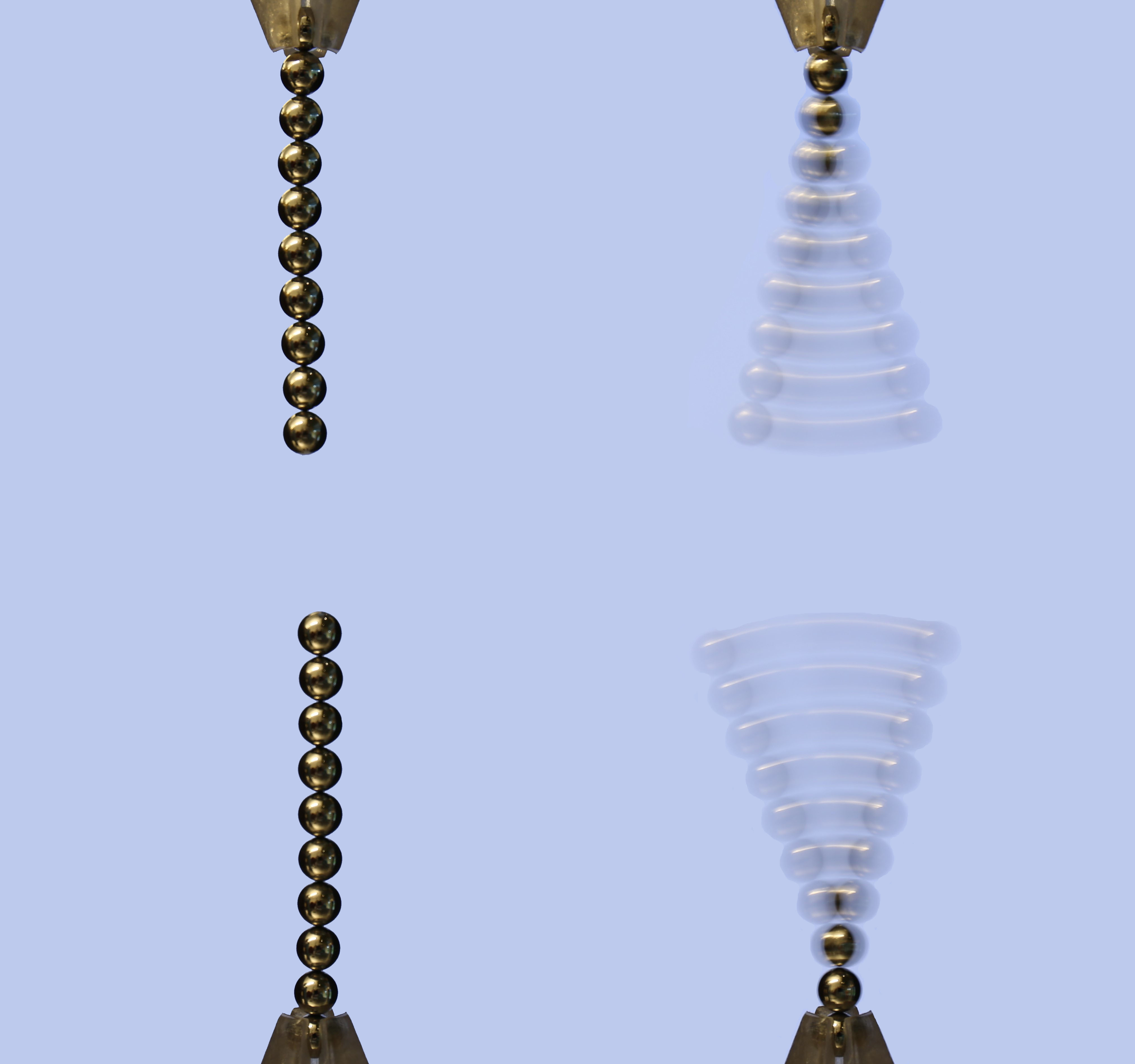 上下に一定の間隔をおいて固定されたペアの鎖で実験をした。左は静止状態、右は振動状態。