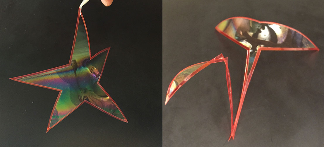 柔らかい枠の中にできる石けん膜は、枠に対して力を加えその形を変形させます。例えば、同じ形の枠でも、石けん膜の表面張力により星形にも白鳥の形にも変形する。