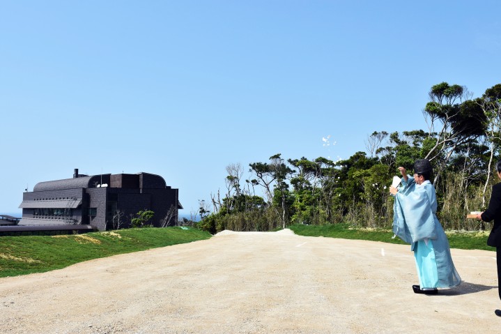 建設地を祓い清める祭主。向こう側に見えるのが第1研究棟。
