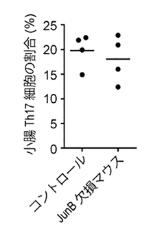 図2 JunBは小腸に常在するTh17細胞の産生に必要ない。 JunB欠損マウスおよびその対照のマウス(コントロール)の小腸に存在するIL-17発現細胞(Th17)の割合を調べた。その結果、JunB欠損マウスと対照マウスともにT細胞の15-25%がTh17細胞であった。このことからJunBは小腸Th17細胞の誘導に必要でないことが示された。