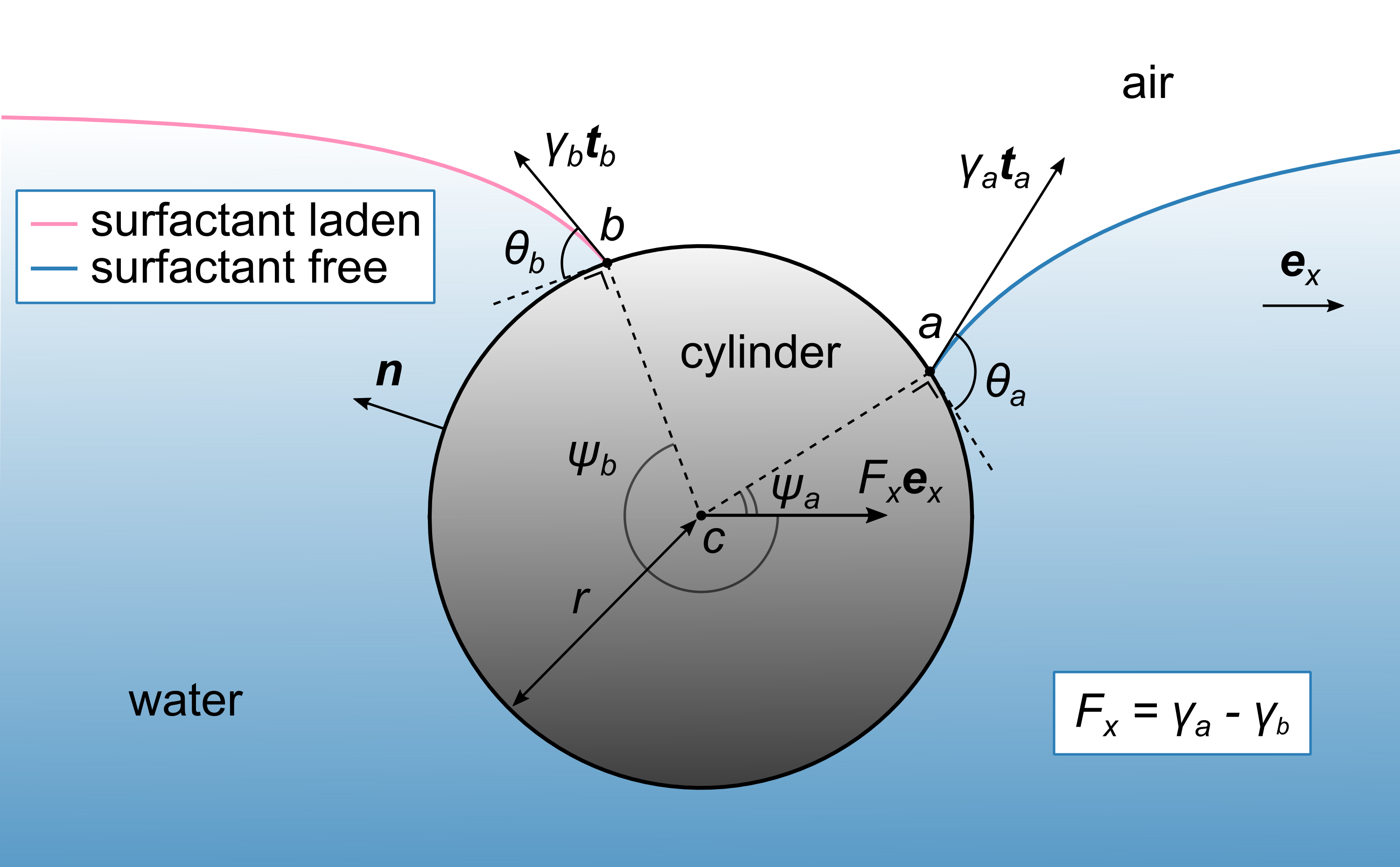 左側の水面に界面活性剤を入れると、異なるカーブで表される非対称の水面が生じ、左右で異なる力が円柱棒に加わる。 円柱棒に作用する水平方向の力は、円柱棒の単位長さ当たりで測定した際の表面張力の差に等しい。