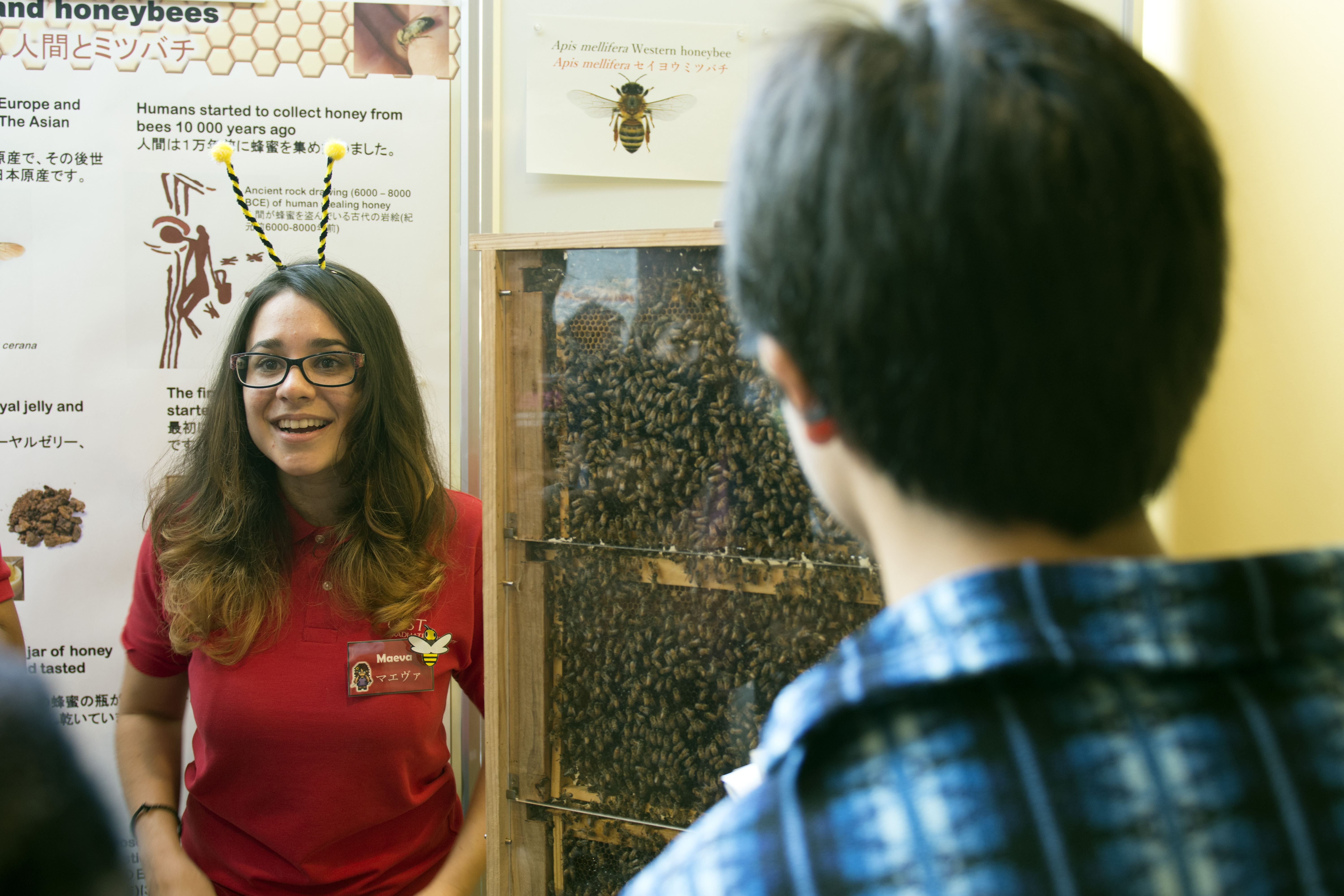 OISTスタッフが、蜂蜜がどのようにして作られるかを説明。来場者は、ハチに刺されたり怖がったりすることなくハチの巣を観察することができた