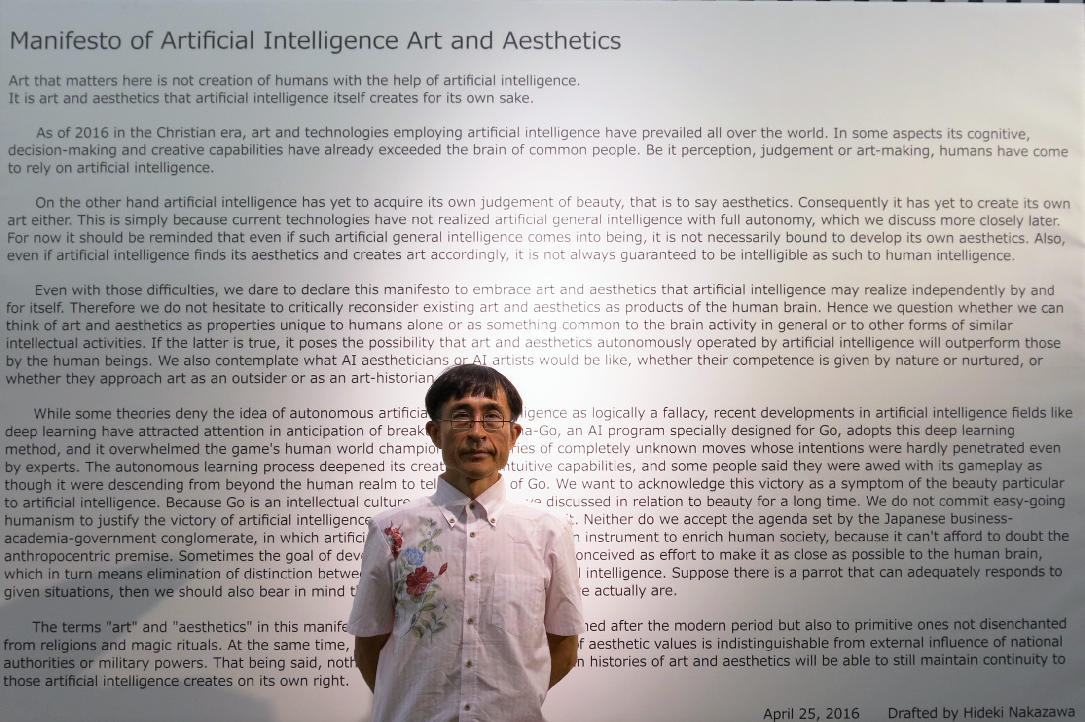 人工知能美学芸術展にて自身が掲げる「人工知能美学芸術宣言」の前に立つ本展企画、美術家の中ザワヒデキ氏