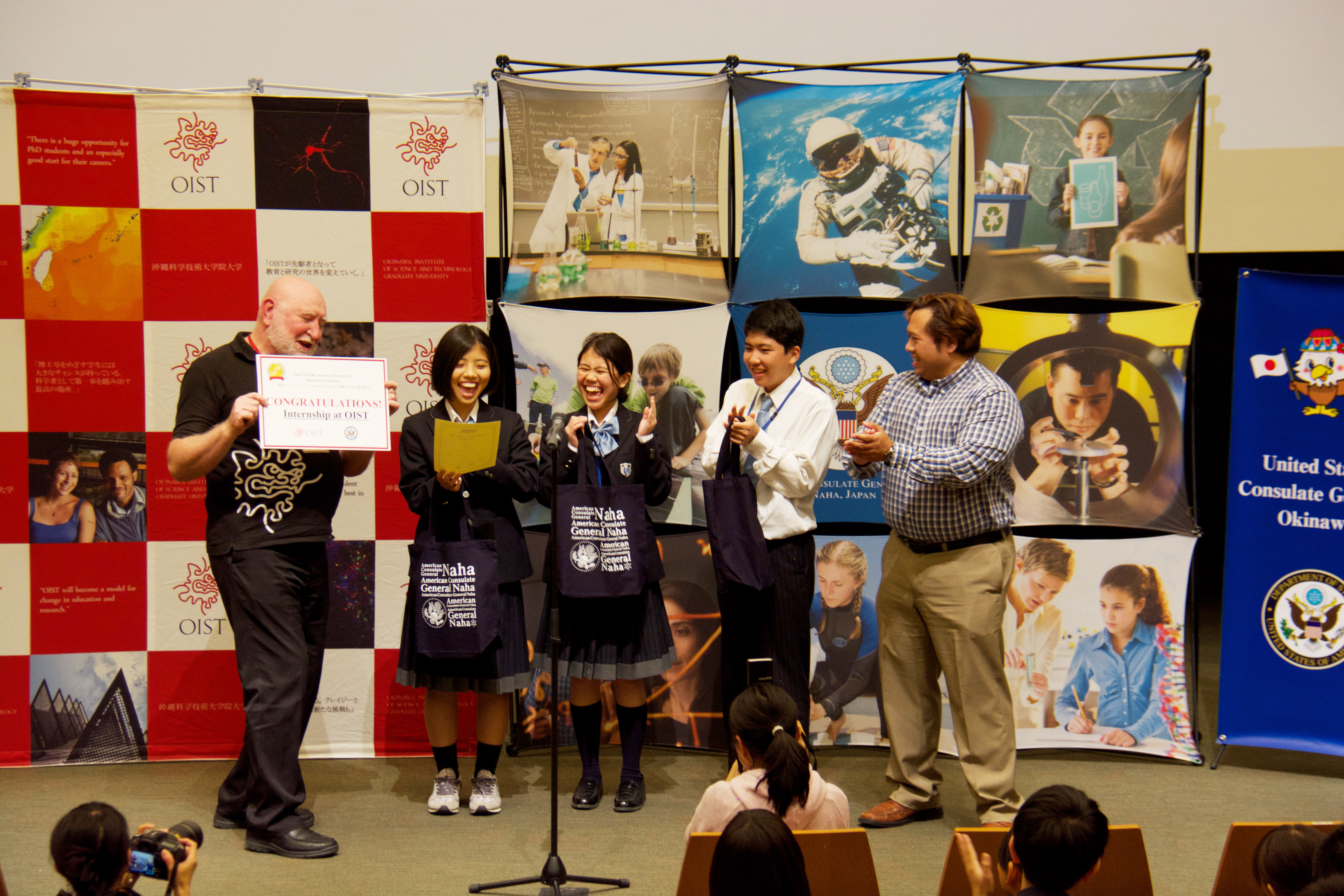 2017年第6回SCORE!で特別賞を受賞した名護高等学校のチーム(玉城明依さん、仲本めいさん、島袋省吾さん)