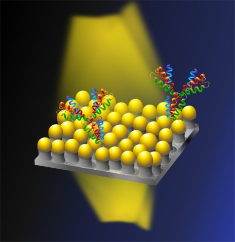 OISTマイクロ・バイオ・ナノ流体ユニットでは、革新的な印刷技術を使い、 生体分子の均一な層で覆われた 何百万ものキノコ状構造を持つナノプラズモニック材料を開発した。