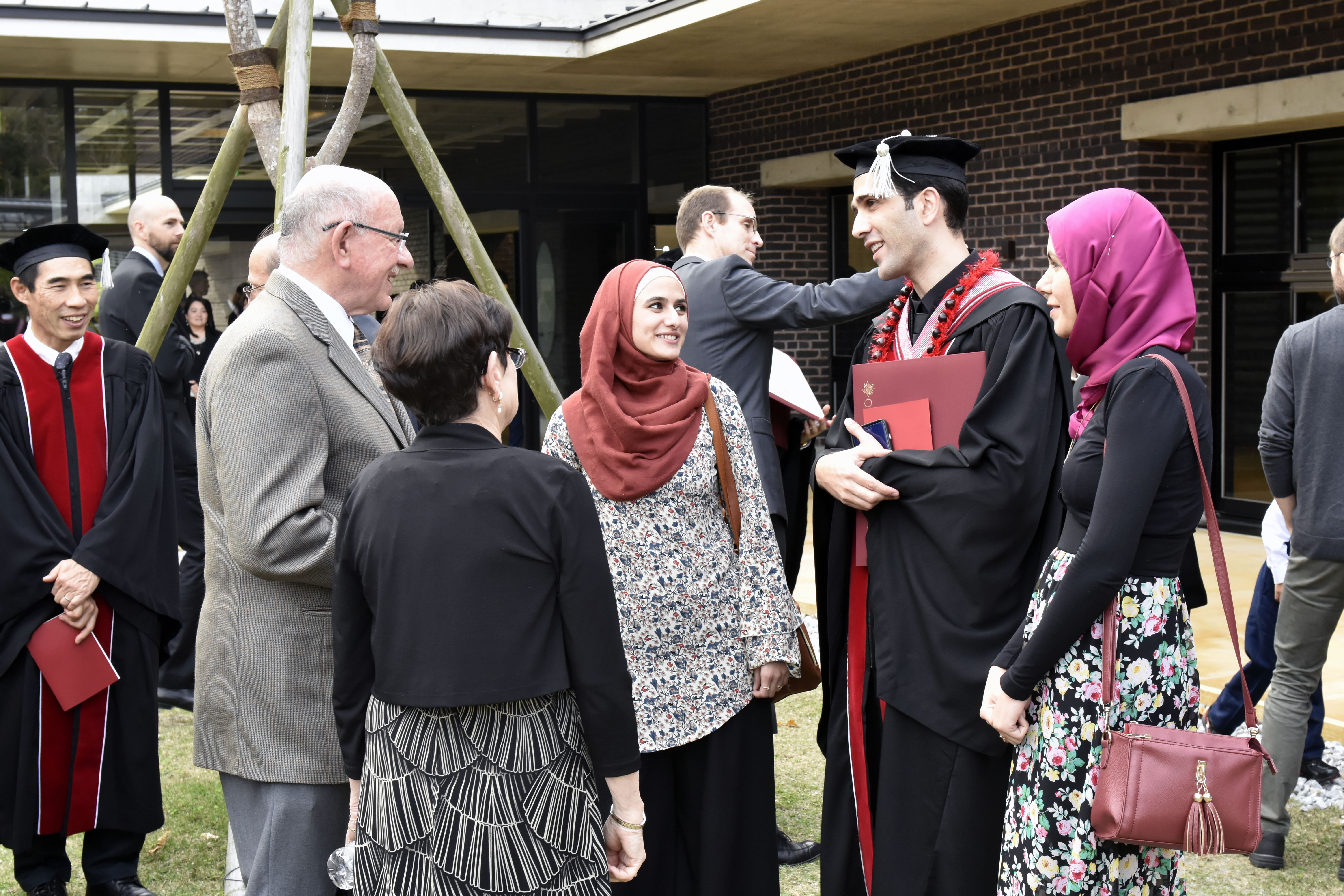 式典後にジョナサン・ドーファン元学長とレネー夫人と談話する修了生のザッファー・ハワッシュ博士
