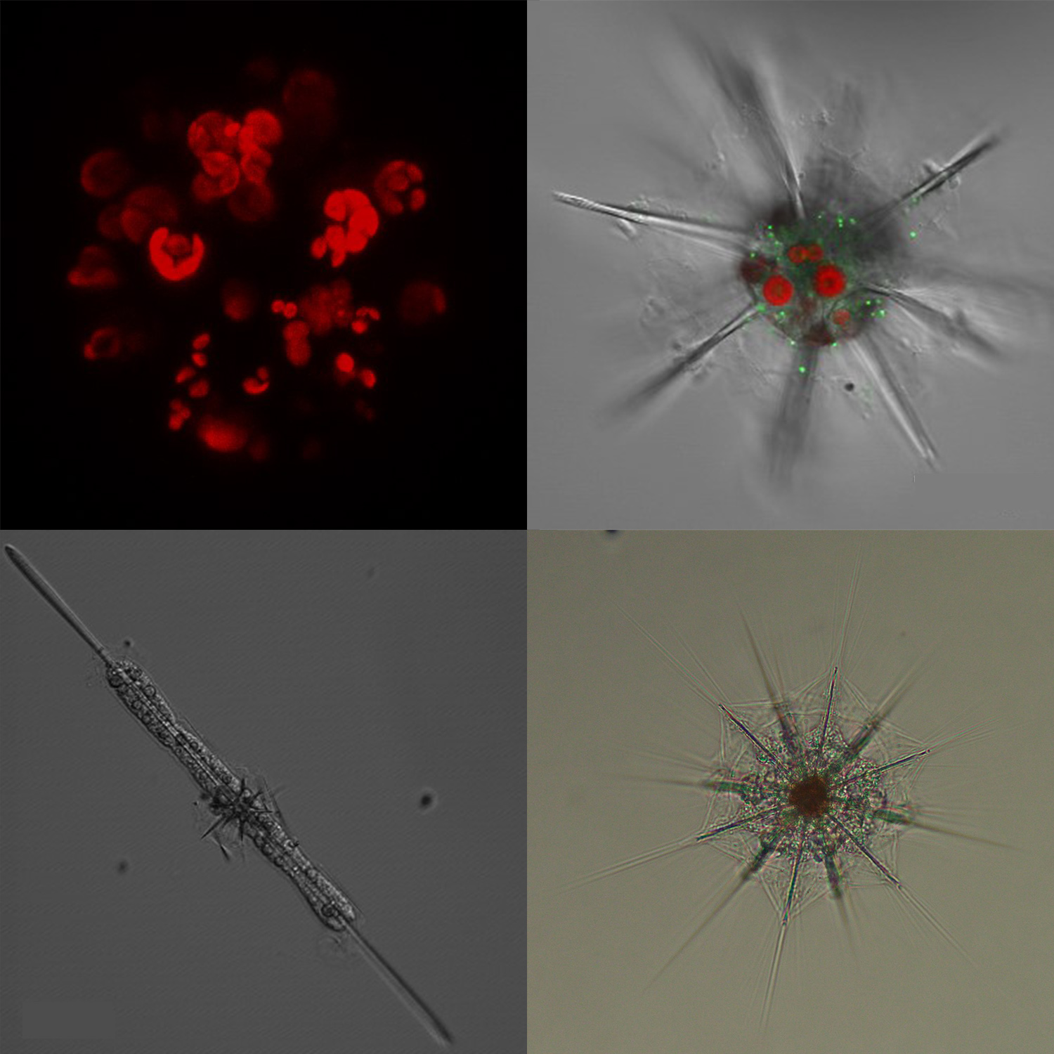 アカンタリアと共生藻は、肉眼では小さ過ぎて観察不可能だが、顕微鏡下では美しい形状や構造が観察できる。 上の2枚の写真で、蛍光赤色の部分は共生藻、 右上写真の蛍光緑色部分は宿主のリソソーム。