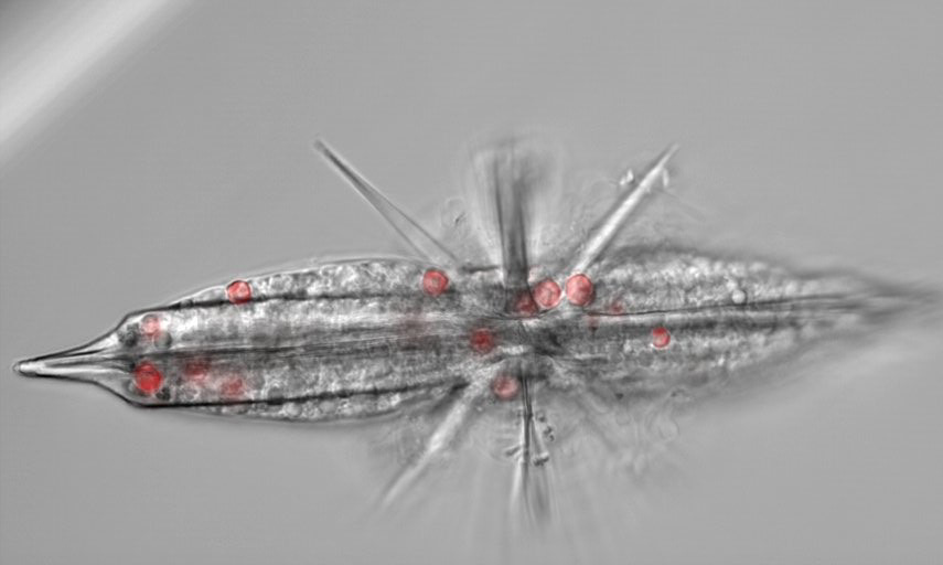 蛍光共焦点顕微鏡で観察された宿主プランクトンのアカンタリアンと赤色で示される共生藻