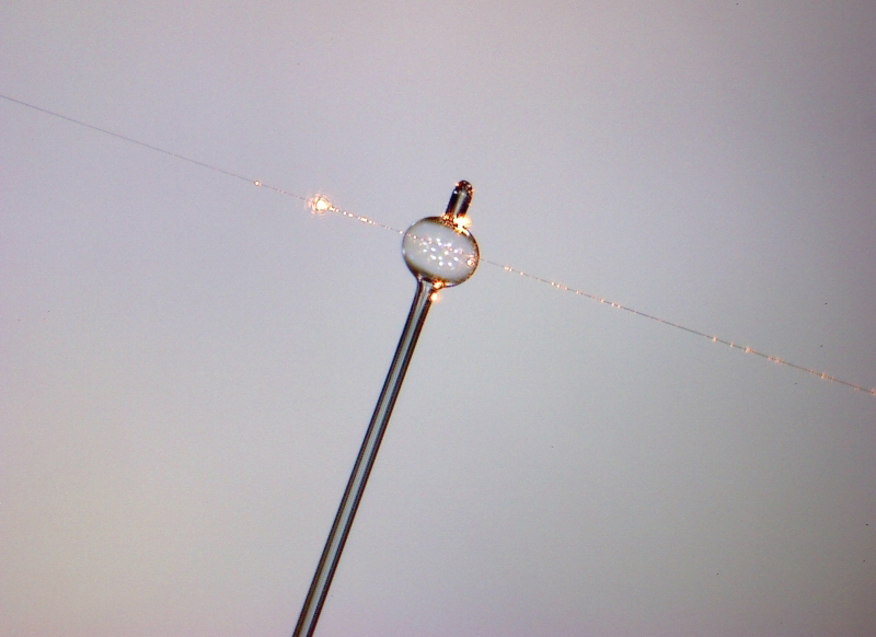 WGR(ウィスパリング・ギャラリー共振器)の拡大写真。気泡は微小サイズで人の毛髪の幅にも満たない。