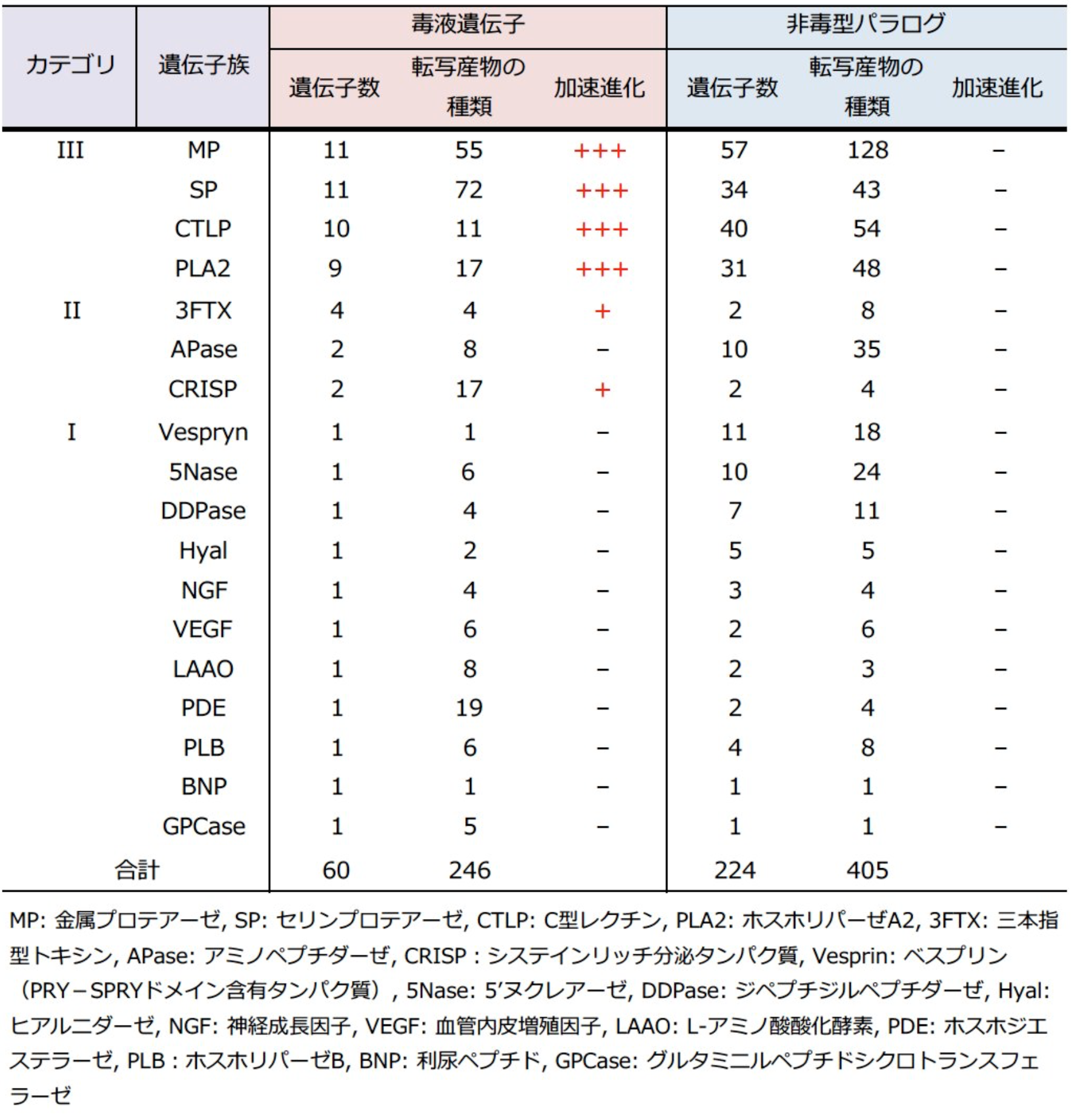 表1:ハブゲノムアセンブリ(HabAm1)から見つかった毒液遺伝子および非毒型パラログ