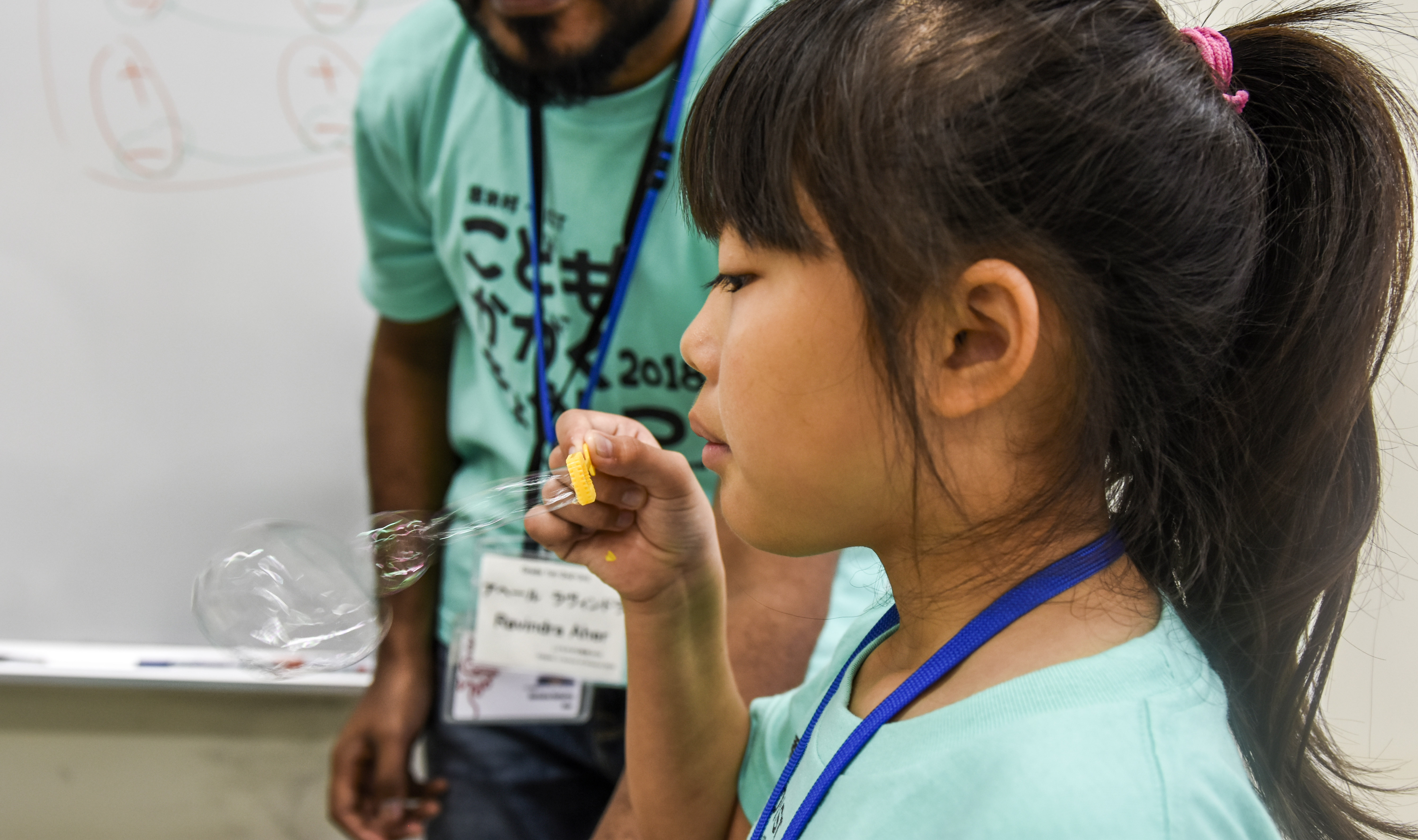 シャボン玉を使って静電気のしくみを学んだ子供たち