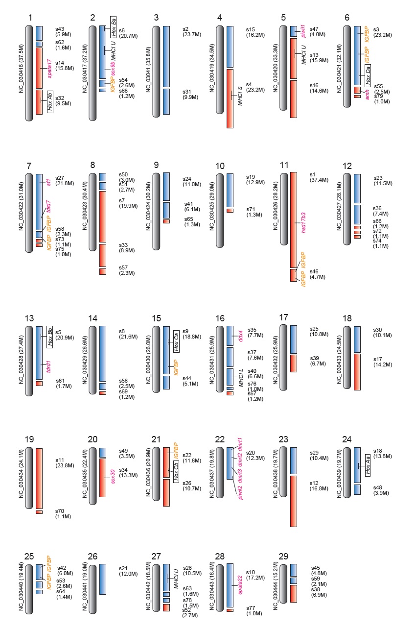 研究者らは、報告されているアメリカナマズのゲノム情報(灰色のバー)と比較することにより、カイヤンの仮説的染色体地図(青色と赤色の四角)を作成した。その結果から、ナマズ2種間における染色体レベルの構造類似性が50%以上保存されているかもしれないと考察した。
