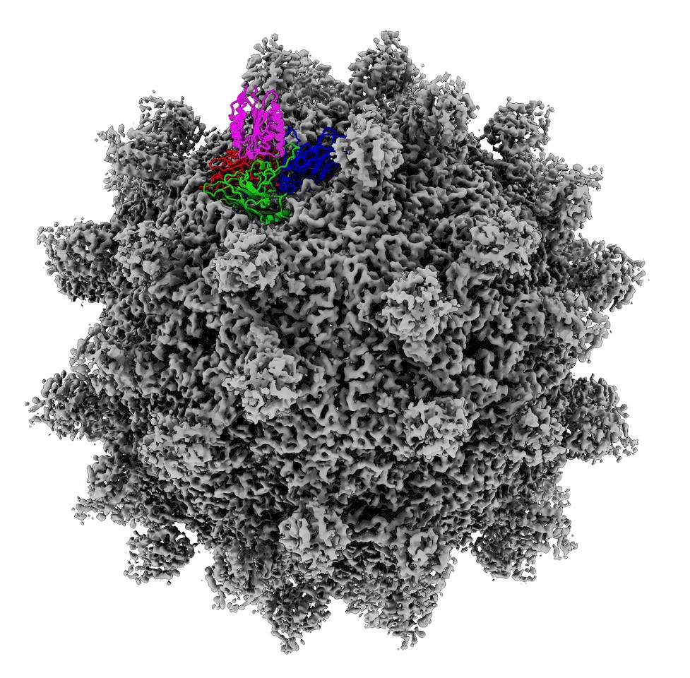 OISTとオタゴ大学の研究者がクライオ電子顕微鏡を用いて撮影したセネカバレーウイルスとANTXR1受容体が相互作用している図。一部が染色された原子モデルとして表されている。青、緑、赤がSVVカプシドタンパク質、ピンクがANTXR1受容体。