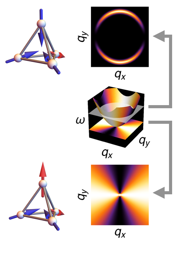 ピンチポイント(下)および半月(上)の一定したエネルギー断面を表す中性子散乱の3D構造(中)。2つの模様は左の2つのスピン構成と一致する。
