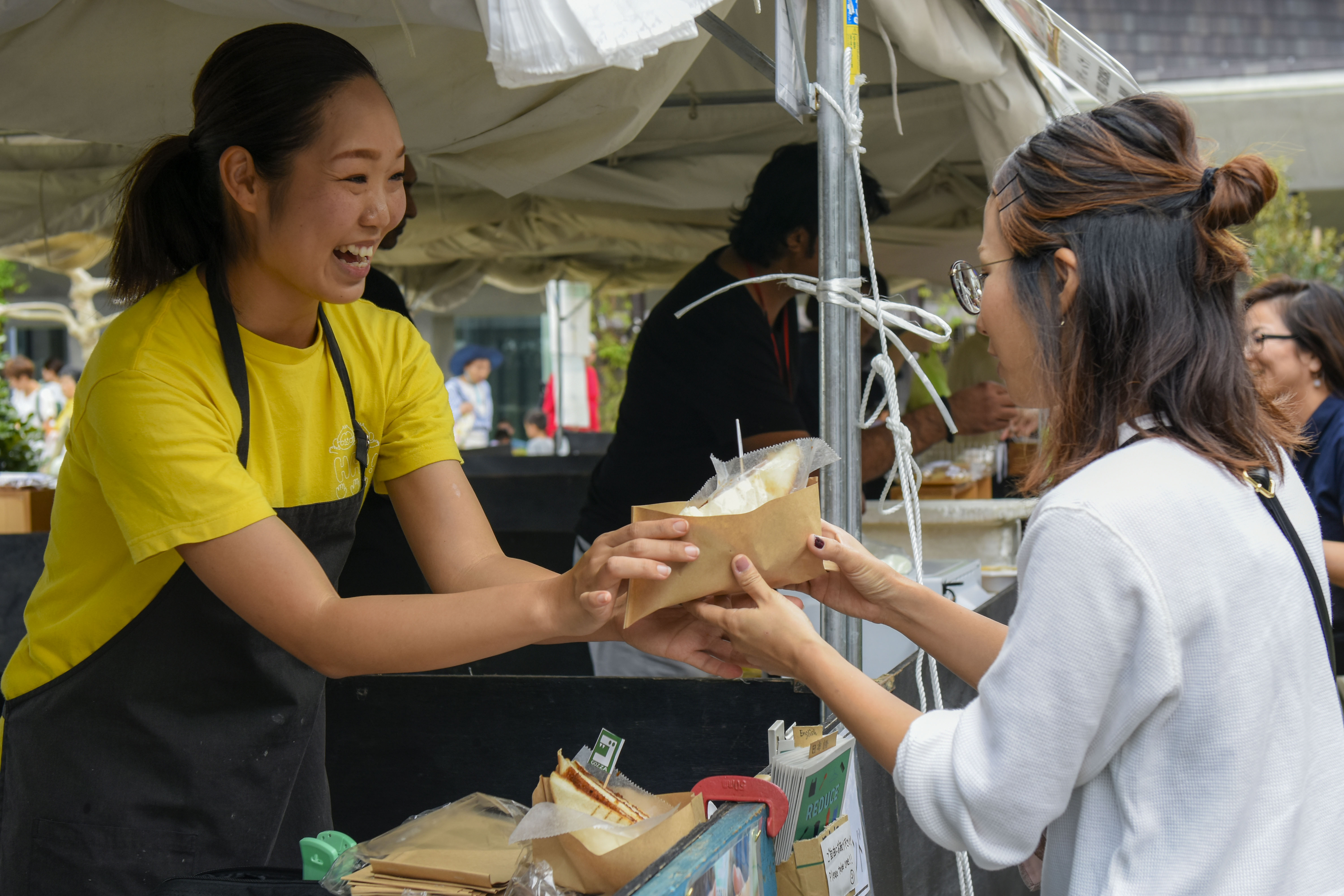 様々な食べ物が販売されたOISTサイエンスフェスタ2018のフードコートで買い物する来場者