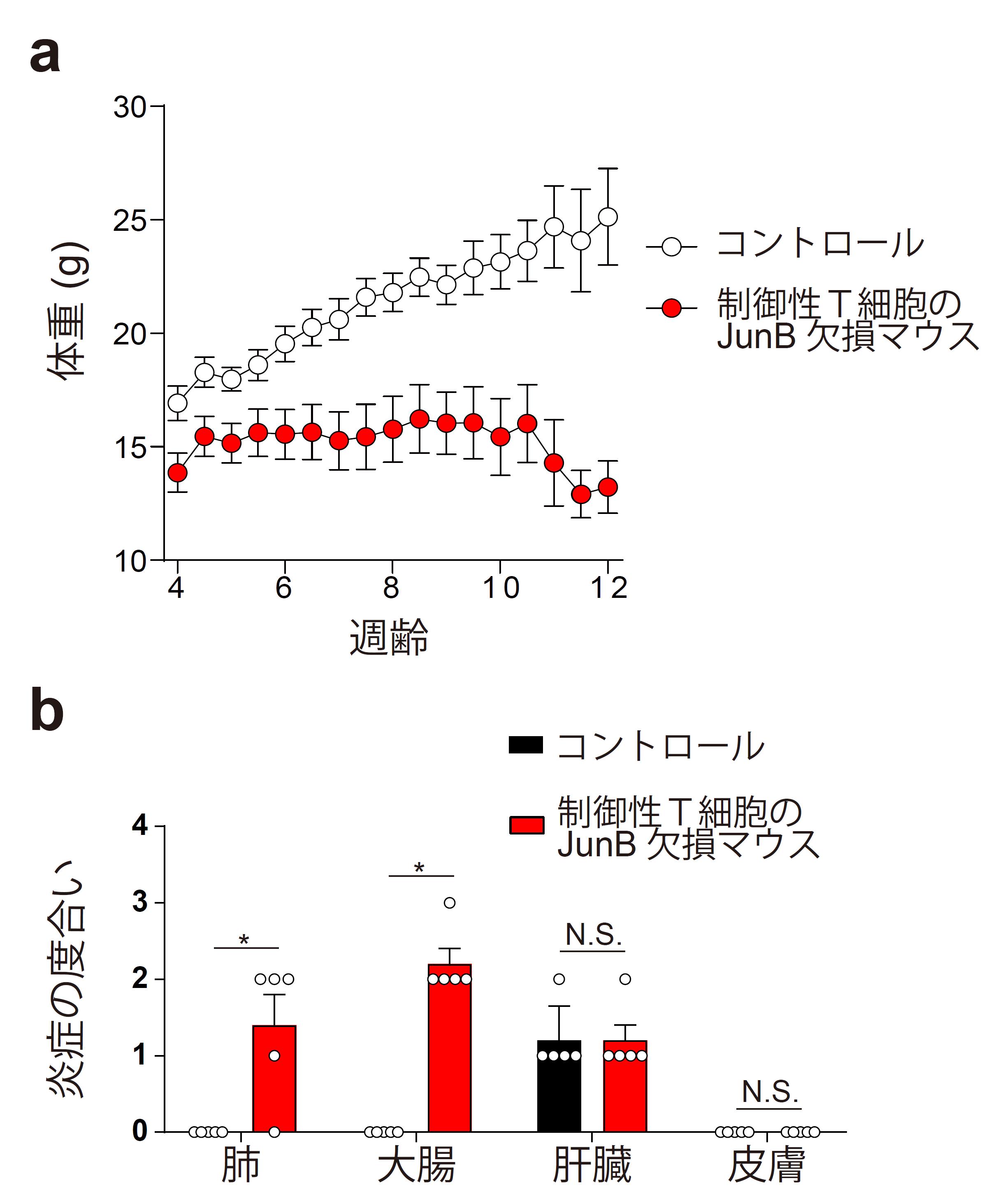 図1 制御性T細胞のJunBを欠損したマウスは体重減少(a)および肺、大腸における過度の炎症(b)を伴う自己免疫疾患を発症する。