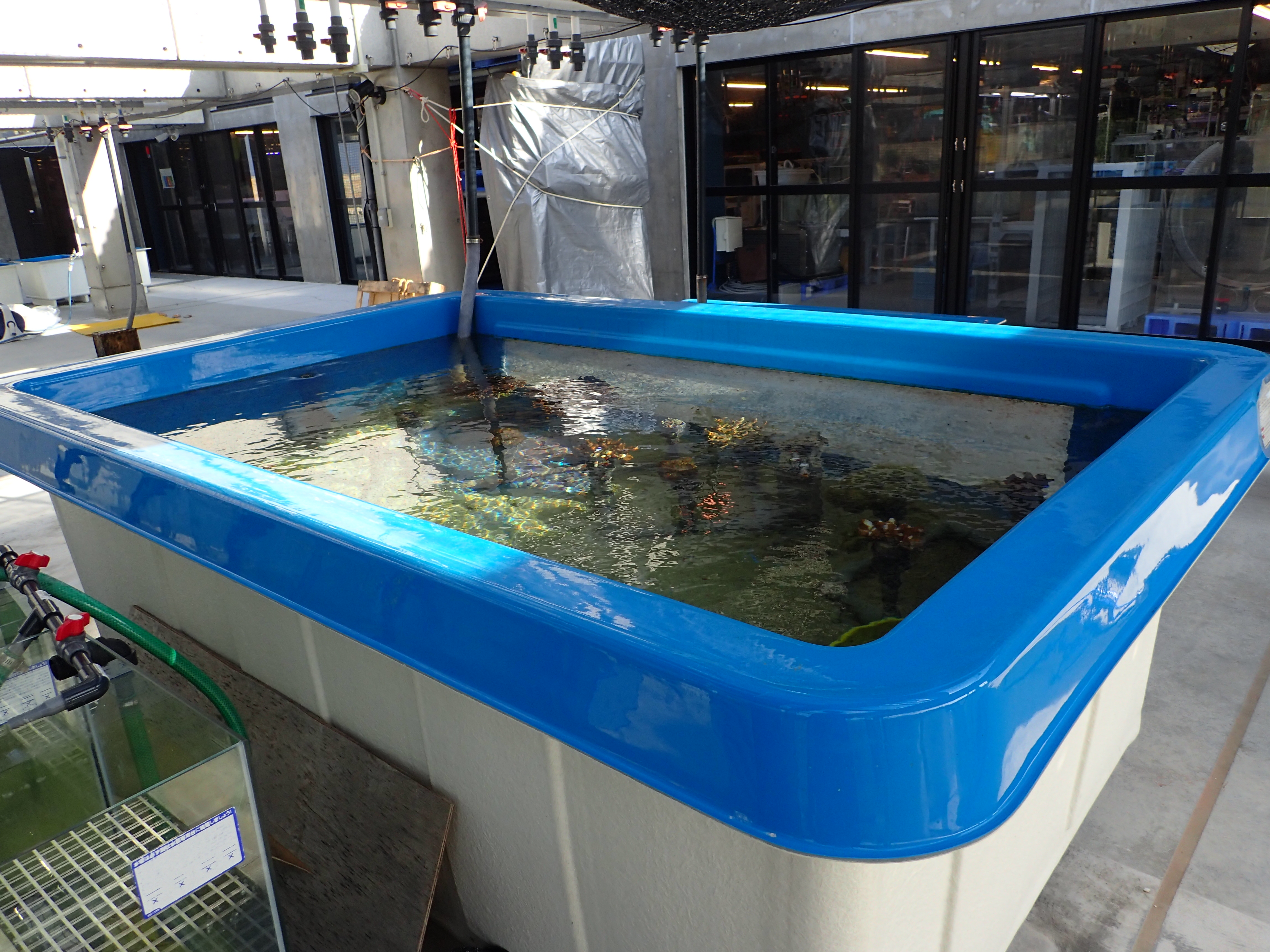 沖縄県恩納村瀬良垣にあるOISTマリン・サイエンス・ステーションでは、海水を入れた大型水槽に数種類のサンゴが飼育されている