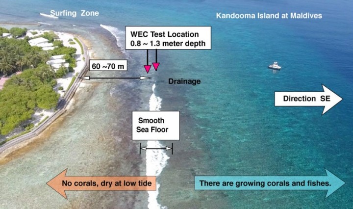 モルディブにおける実験では、直径35センチのタービンを備えた 2台のハーフサイズの波力発電機試作機を設置しています。簡素化のため、試作機のブレードは、予定されている柔軟な設計ではなく 、高強度アルミニウム合金のジュラルミンから作られています。 本試作機は、 カンドゥーマ島の南東側の海岸から約50メートルの沖合に設置される予定です。この場所は、環境や景観への影響が少ないよう配慮し選択されました。サンゴが生息しておらず、浅瀬で、サーファーやダイバーが近寄らないホテルの裏側に位置しています。