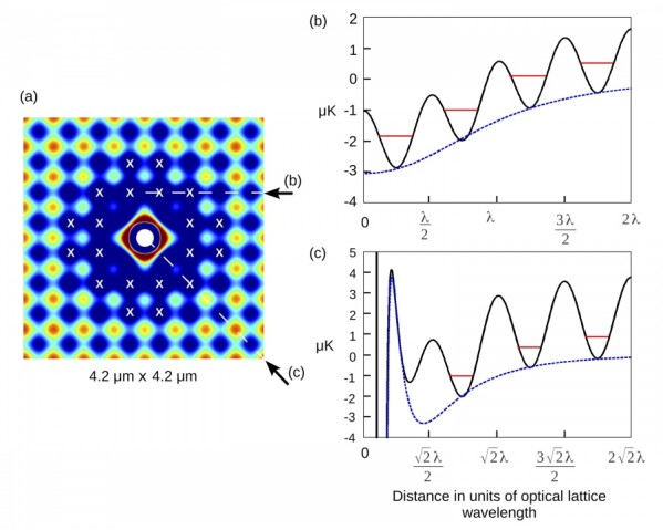 The figure shows an example in which the original lattice positions are identified, which are effected by the optical potential around the fibre such that the atoms are trapped in the fibre-trap after the lattice is switched off. For this set of parameters a sample of 20 atoms is created.