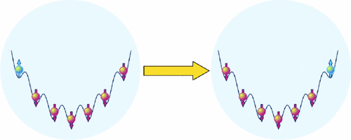 Schematic diagram of the physical implementation of the proposed QST protocol. The spins are arranged in a nonhomogeneous potential obtained by applying a site-dependent external field. The goal of the protocol is to transfer the “up” spin (blue) from the first site to the last one.