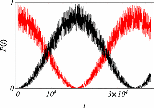 Dynamics for a chain of eight sites. Full transfer can be achieved and he fast oscillations represent the deviation of the real dynamics from the two-level approximation.