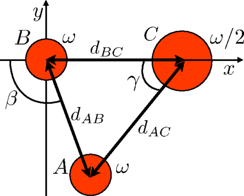 Schematic representation of the system of three harmonic traps with broken spatial symmetry. Traps A and B have the same trapping frequency and trap C has a trapping frequency of half that value.