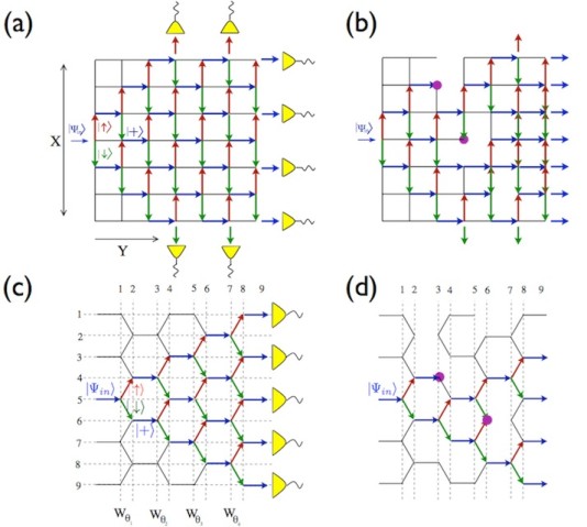 As a continuation of this work we have studied percolation of photons in an imperfect array of beam-splitters, where the dynamics is determined by the interplay between percolation, backscattering and transient localisation. From both these studies one can conclude that even with a directed nature of the evolution, a very high percentage (close to 100%) of well connected lattice sites is required to obtain a non-zero percolation probability even on lattices of finite size. Thee exact values for the transition points on finite lattices however dependent on the lattice type.