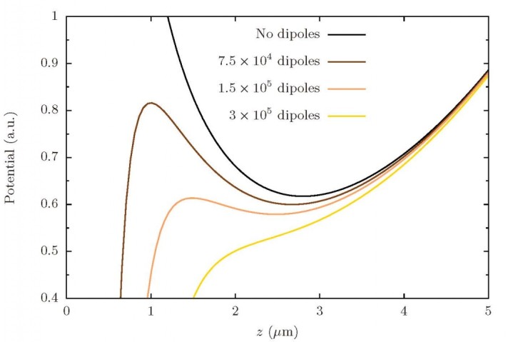The figure shows the total potential felt by two 40Ca+ ions (in the relative coordinate) for different dipole densities between them. A change of around 10% is easily achievable.