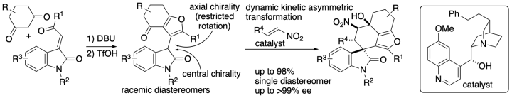 Whereas kinetic resolution reactions afford the products up to 50% yield, dynamic kinetic transformations can lead to the formation of the products up to 100%. We developed dynamic kinetic transformation-based diastereo- and enantioconvergent Michael-Henry reactions that afford spirooxindoles bearing furan-fused rings (Scheme 11) (Sohail and Tanaka, Angew. Chem. Int. Ed. 2021, 60, 21256). Dihydrobenzofuranone derivatives were synthesized in racemic diastereomer mixtures, and these were transformed to the spirooxindoles bearing furan-fused polycycles with high diastereo- and enantioselectivities through the dynamic kinetic process. Regardless the stereochemistry of the dihydrobenzofuranone derivative, all four isomers originated by central and axial chiralities were transformed to the single diastereomer product with high enantioselectivities.